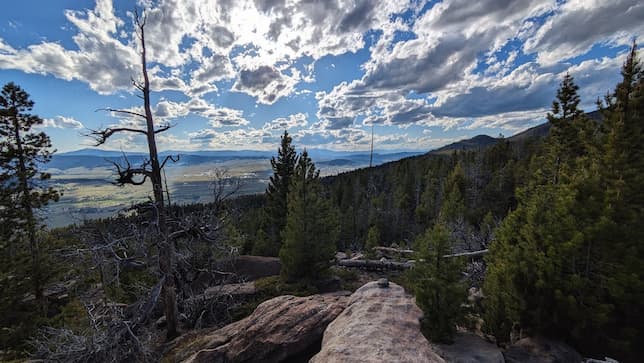 The late afternoon light is hitting everything just right, turning those hills into a patchwork of gold and green. Dead trees mixed with living ones create this crazy pattern across the landscape. Montana showing off, as usual.
