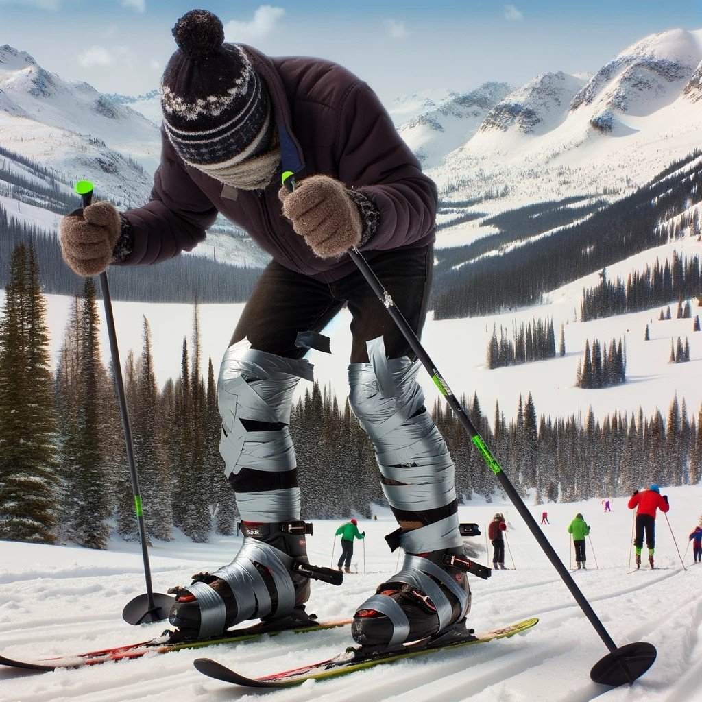 A couple of miles later, I fell backwards and broke the binding completely off the ski. So we brought out the duct tape again, this time using all we had to tape my boot to the ski.