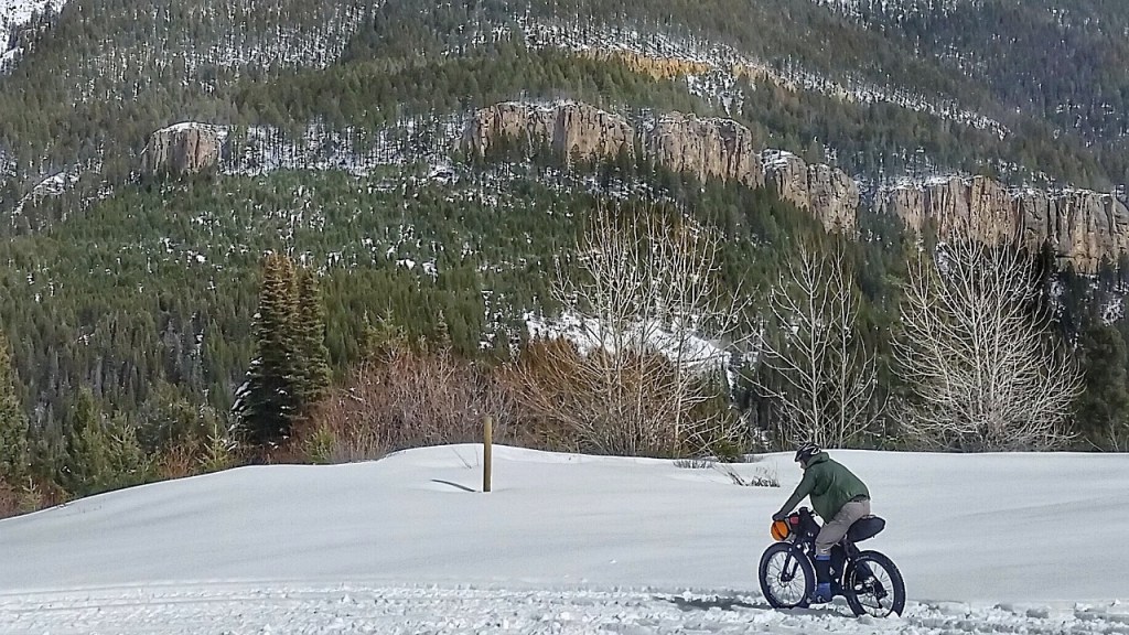 The beginning of the ride was nothing that resembled fun. The access to the trailhead was at one time a packed snowmobile trail. But the weather had turned warm and some vehicles had really trenched it out. My beetle high-centered before I could get to far and I had to back out and go back down to a farm to park. Then the ride up to where the trailhead was like riding up glacial run-off. Even when I got past the running sand water I had to ride a mile through 6 inches of slush muck. But before I was able to start getting miserable the trail firmed up and that big ol’ snow biking grin grew across my face.
