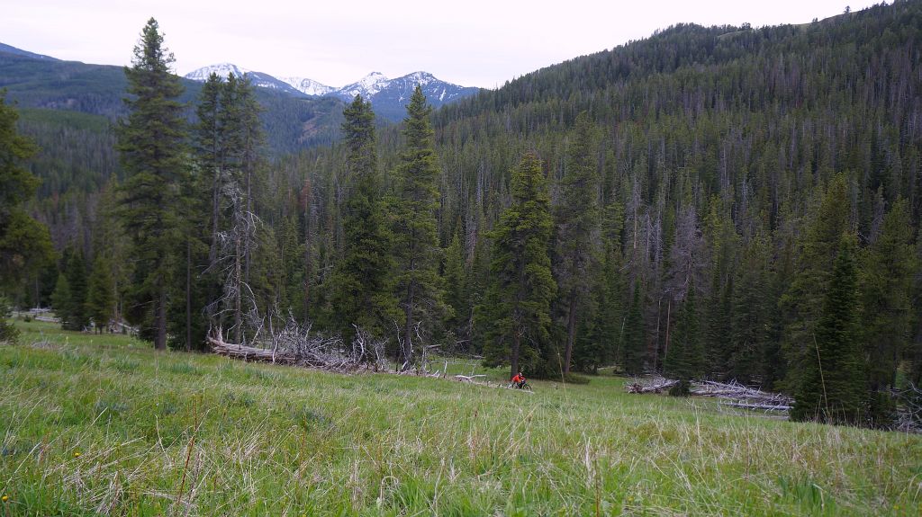 Another hour pushing up the hill and we emerged onto a ridge. And it was not an easy hour. In fact it was much harder and required more hike-a-bike then the earlier 3 hours. But now we got a huge reward for our efforts. The Gallatin Range spread out before us and everything was green and rugged. Real cool We threw down the bikes and enjoyed the remaining sun light …