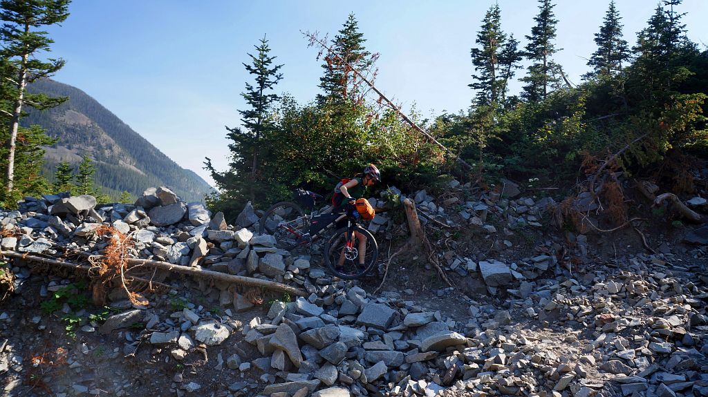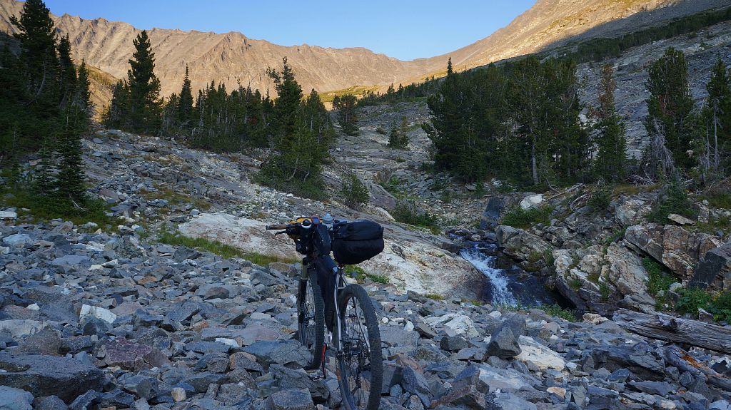 After a huge effort we made our way to an area that seemed to be letting up. As my head turned up the valley I could see we were still very far away from our destination. Sure it was like a quarter mile. But it was a quarter mile of rock fields, scree slopes, and creek crossings. Not a chance in hell to ride these bikes. And at the end … another steep pitch.