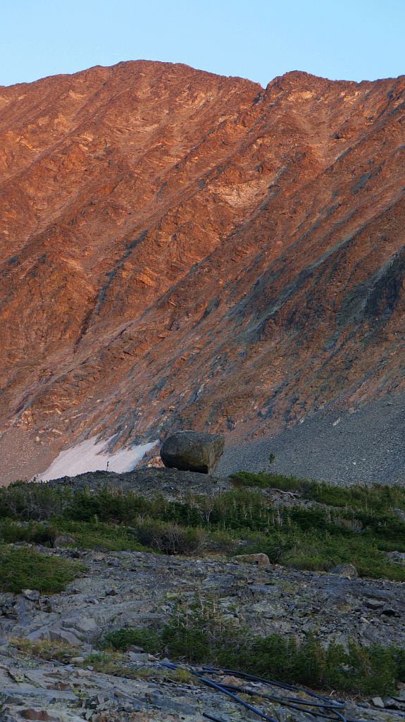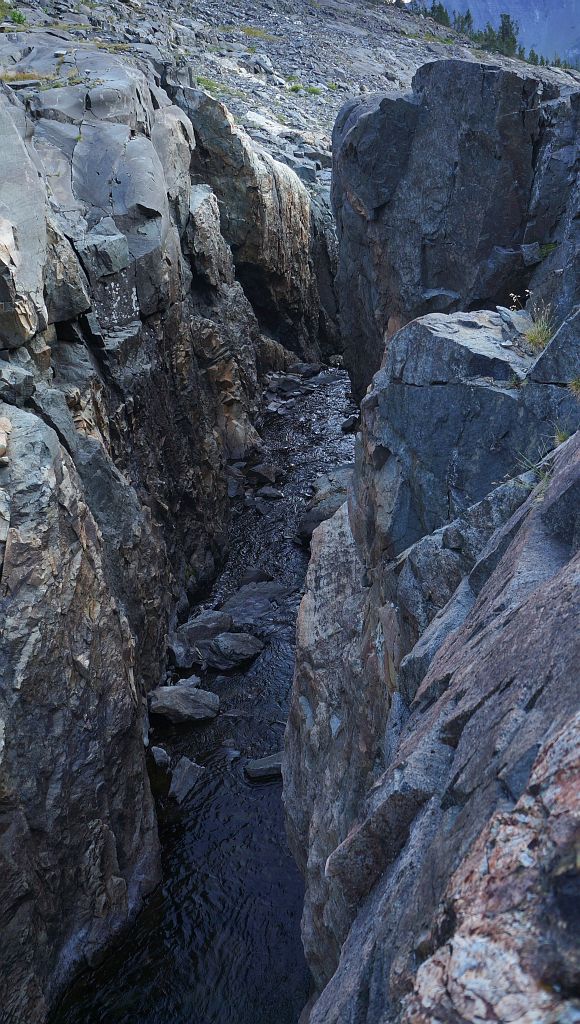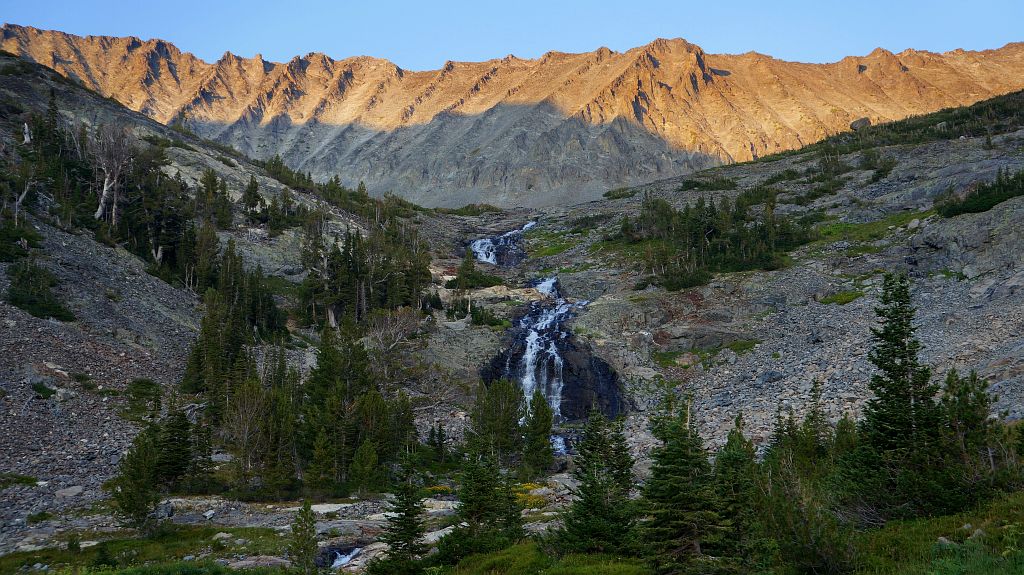 The last pitch was almost to much and the only sane thing that kept me engaged was the beautiful waterfalls around each corner. Finally I broke above the cliff and scampered across a rocky saddle. The sun about to set was casting a red glow on Iddings Peak.