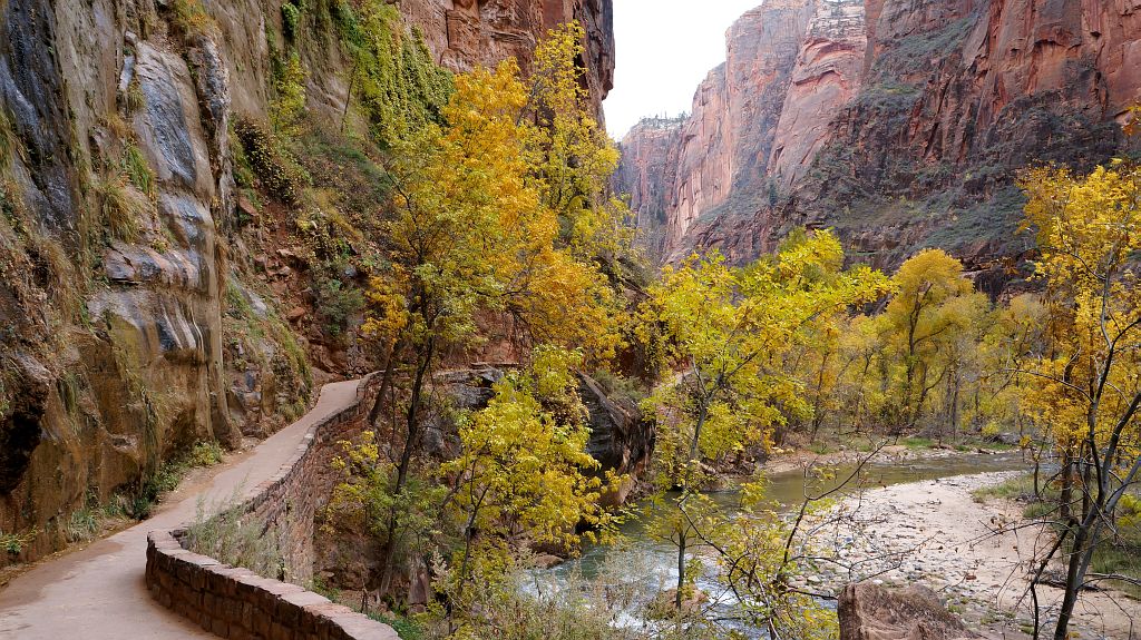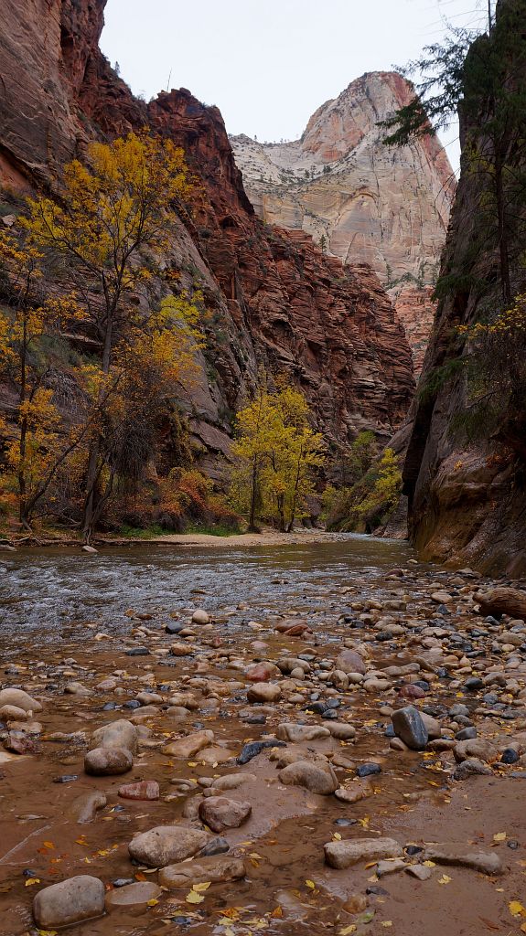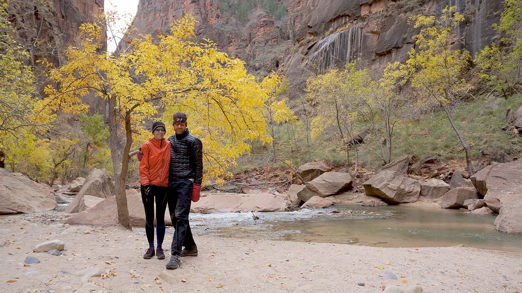 The cool feature of the Parus Trail is that it snakes and crosses the Virgin River many times affording us many photo ops of the fall scenery. We pretty much had this trail to ourselves since it was off-season and the roads were open for cars. I mean if you can drive why walk? Right?