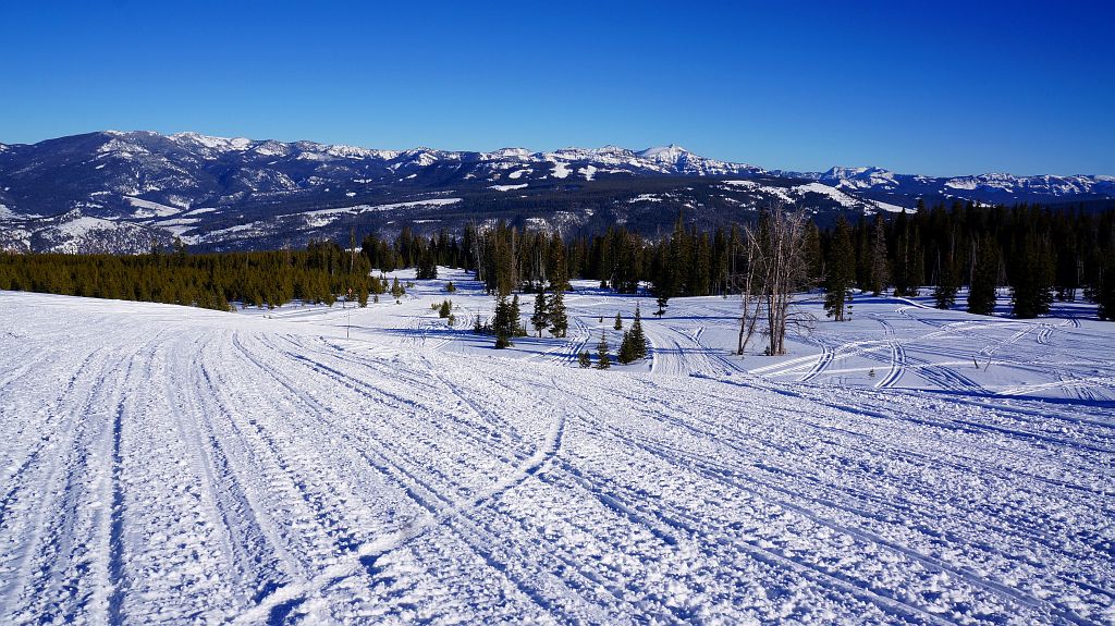 Interestingly enough as we approached the end of the ridge trail we saw more evidence of illegal snowmobile travel into the wilderness area adjacent to Buck Ridge. The official Buck Creek Ridge Trail Ends as indicated by the posted sign (orange diamond with vertical black line signifying the end of the trail) and the sign indicates this area is closed to prevent damage to vegetation that NO motor vehicles including snowmobiles (the last icon with a red line through it on the sign) are allowed past this point. However, anyone can clearly see the extensive traffic into the closed area, going right past the sign and into the adjacent wilderness area. This trail was compact enough to walk on without sinking. Additionally while we stood at this sign marveling at the illegal activity, just two ridges over were four snowmobiles high-marking to the saddle high on the ridge and clearly in the wilderness (Lee Metcalf) section of this area. We were appalled and aghast again by the violations being committed by snowmobiles in this area. We only mention this because as responsible forest users it was disturbing to us that so many ‘motor vehicle’ violations were occurring in this beautiful area. We support the use of snow-machines in this area as fat-tire cyclist we depend on compaction but we DO NOT support entry into wilderness or other illegal travel that was clearly being violated and clearly marked with FS sign postings on Buck Creek Ridge.