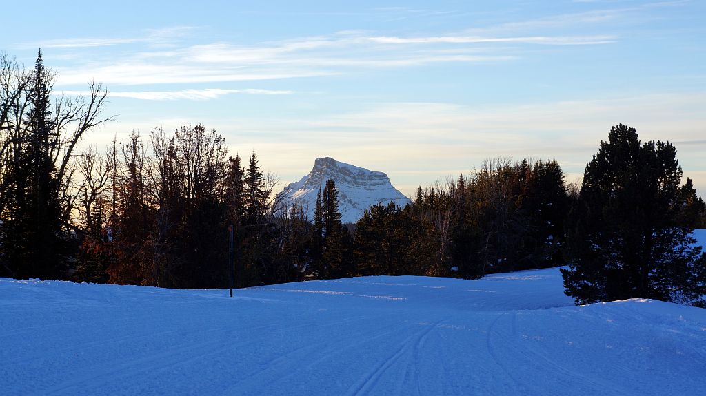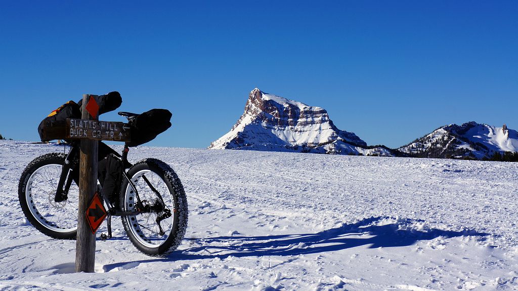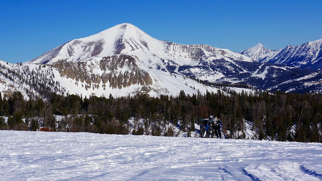 The next day was also sunny and nice, we had a decent rest in the cabin and decided to go back to Buck Ridge with the bicycles to explore the remainder of the snow-machine route/ridge and we wanted to see the ridge in the daylight, since we arrived by our lights at dusk. We had also brought snowshoes for travel but the surface was so good for bicycle travel that we decided to bicycle on the ridge, take pictures of the awe-inspiring peaks (including amazing views of the Sphinx and Lone Peak), and bicycle to the end of the designate route/ridge.
