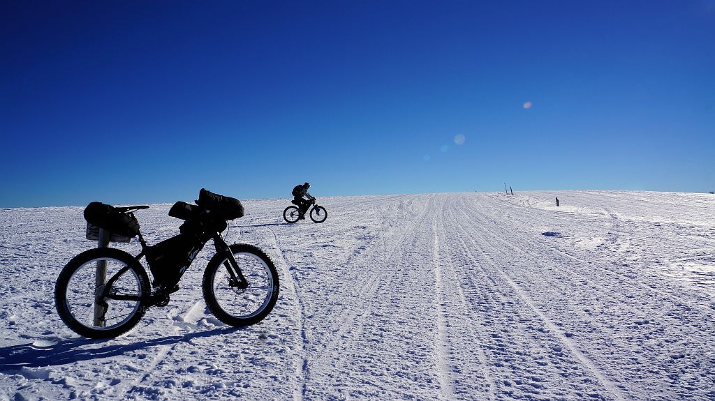 Travel by fat bicycle was possible across most of this wide ridge, where snowmobiles had already cross-country traveled, both on and off what might be considered the “official” groomed route. That is there is so much cross-country travel on this ridge, evidence of where an official “groomed route” begins or ends is essentially non-existent. The snow-machines are self-groomers in that if there isn’t a tree in the way the area is cross-country traveled and self-groomed by snowmobile traffic. ALL open areas of this ridge and in particular on top of the ridge are self-groomed by snow-machine traffic, the “official” route is essentially indiscernible. As a fat-tired cyclist we depend upon the snow-machines for compaction, even though we only need a trail 12 – 16 inches wide, we were thankful for the compaction on the Ridge, we were very amazed at the amount of cross-country snowmobile travel, but thankful that the snow-machines were on this ridge providing compaction, as you can see it was a beautiful day to be on top of Buck Creek Ridge.