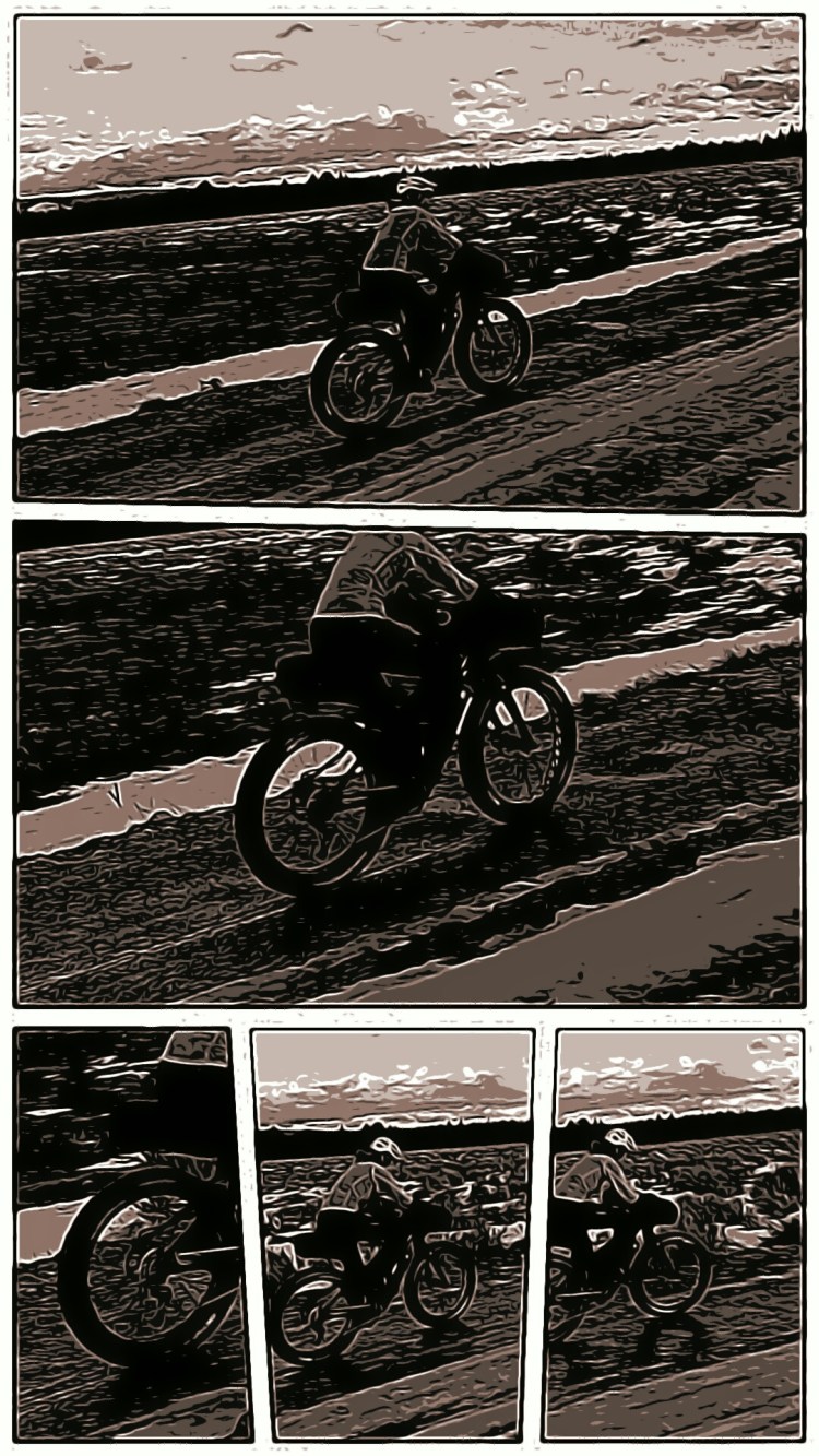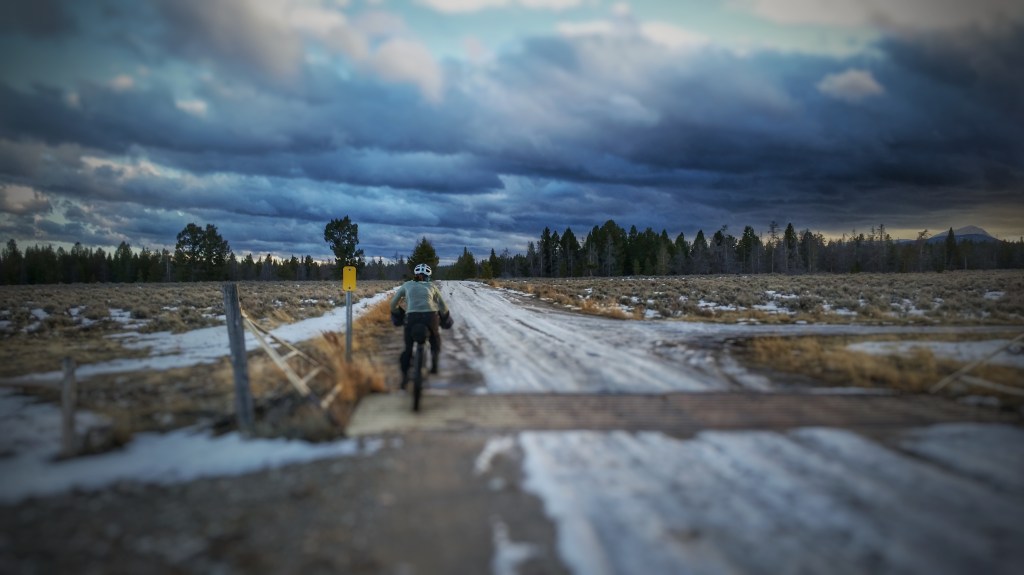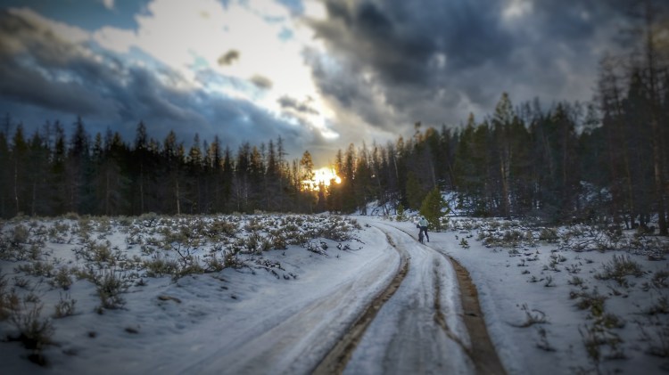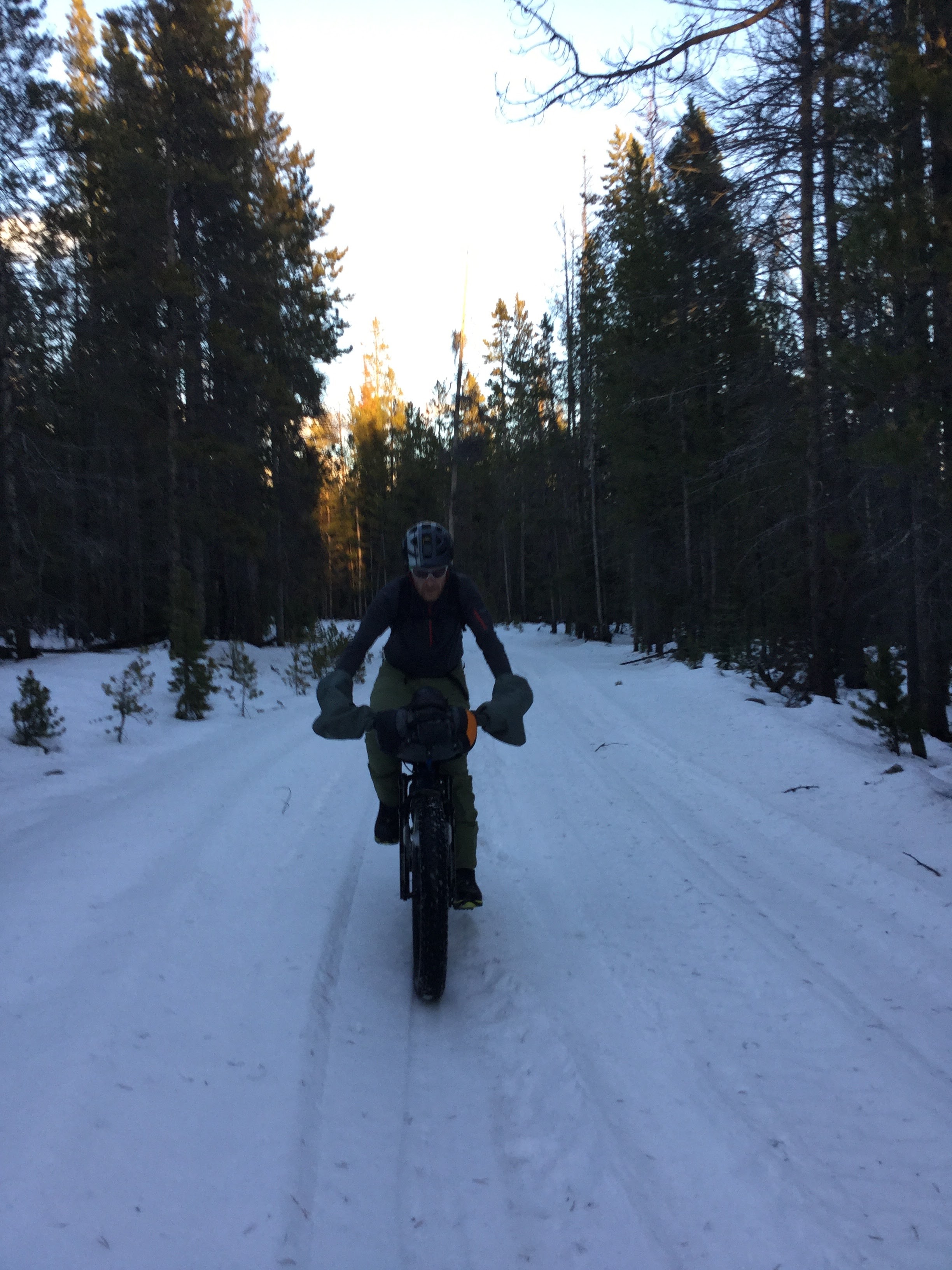 The sunset appeared in front of us as we were walking our bikes. We rode on snow for about a mile then I started to sink through the snow. With temps in the 50s I started to shed layers. Our tracks burned through to the ground and produced a 3-inch deep layer of slush water. And I can say this much. Pushing in slush is really tough. Snuggles rode past me because she was light and could float. About 2 hours later I got a message on the radio.