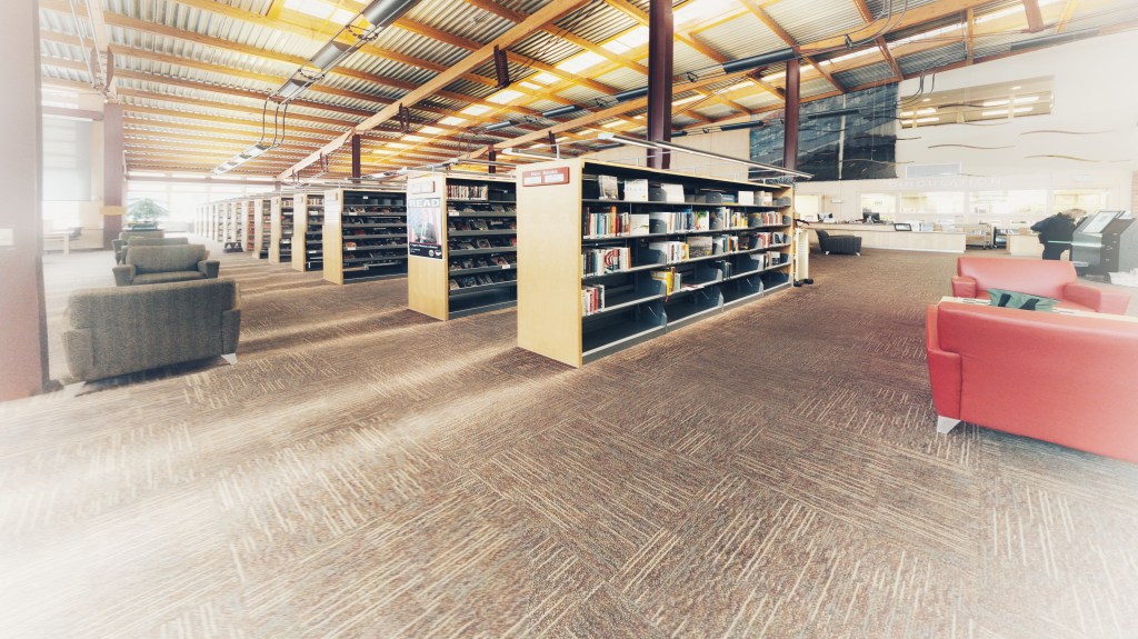 I went to the library with my partner and while she was printing out shipping labels I wondered around. Why not check out some corners of the building that I haven’t seen? I walked to the end and looked out the window. Nothing but cold winter there, yuk. There were sloths staring at their computers. It was quiet down here. I went back and selected a random aisle. I went down it. It seems to just keep going. I noticed that the books were getting bigger and bigger … until they were the size of doors. What? I slid one out, it was on rollers and walked into it.