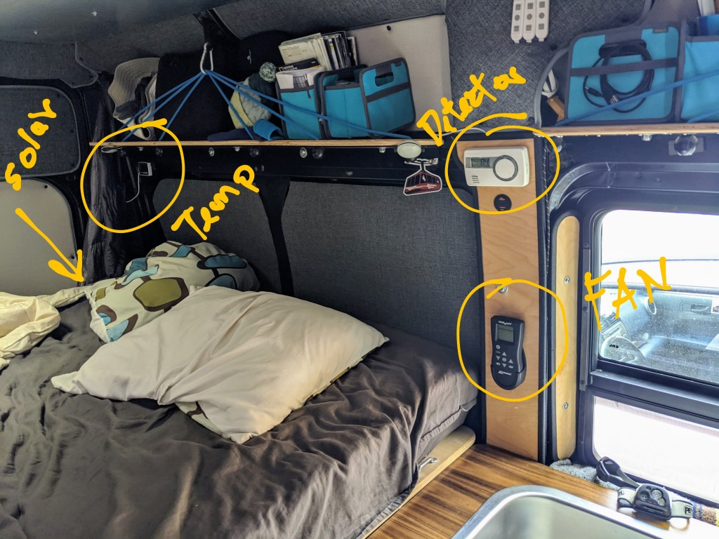When cornering Buttons throws all the stuff we have lying around across the van. So today I am mounting all the gadgets we have. Outside thermometer, solar hookup, the fan control, and carbon monoxide detector. All mounted today. See Buttons images at https://photos.app.goo.gl/xi75cEsy7oNhD6TUA.