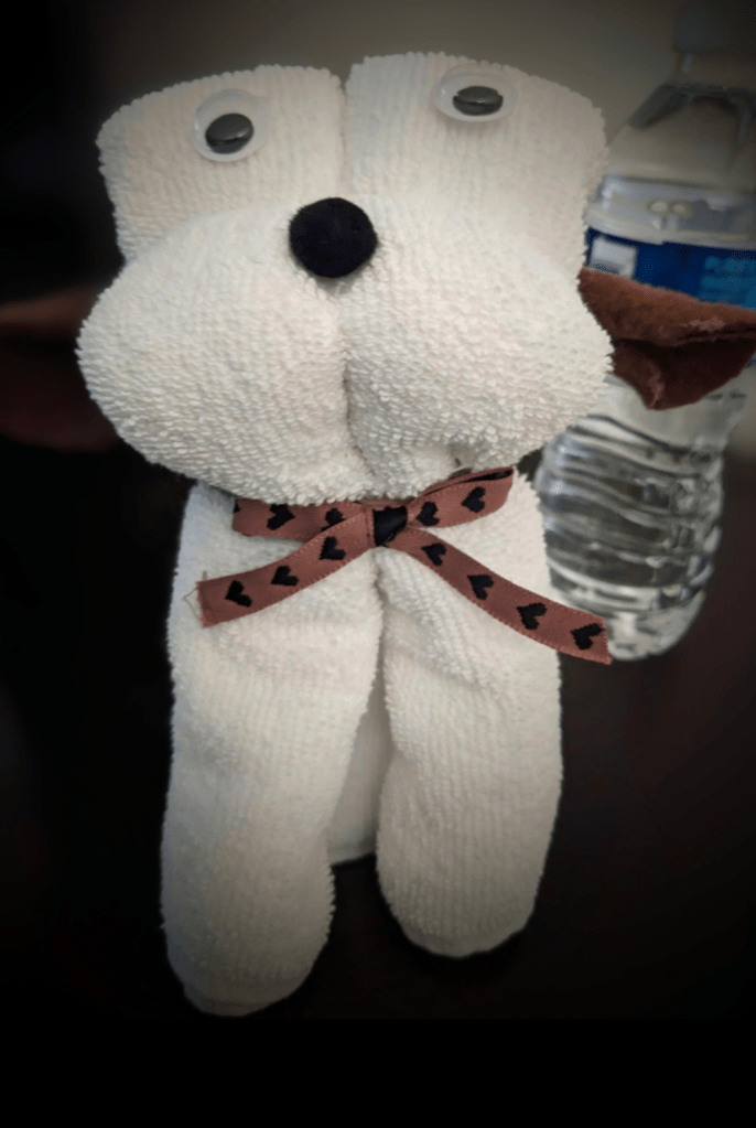 In a cozy corner of the bathroom, Terry the Towel Dog sat, his button eyes gleaming with a spark of adventure. He wasn’t your everyday towel turned canine; oh no, Terry was a dreamer. With a finely tied bow tie gracing his neck, he was the epitome of towel elegance.