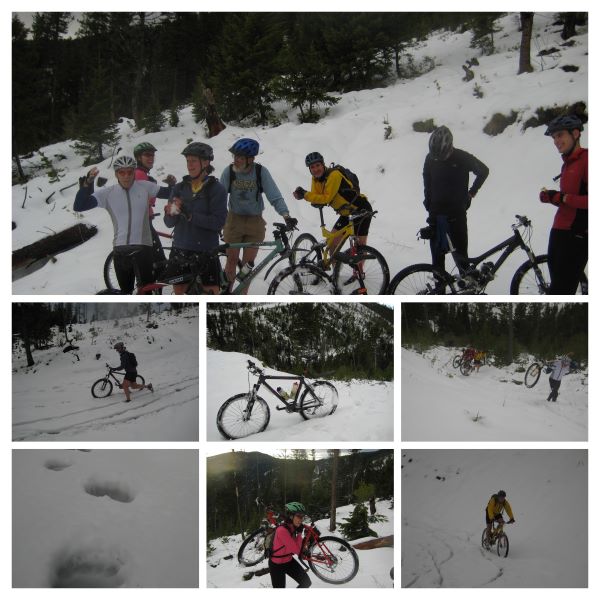 The ride down was the worse. Cold raging water, no brakes, and slippery slush kept things interesting. I think Josh was one that found themselves on the ground. I crossed the little stream at the bottom of the decent and my feet came out in blocks of ice. Brrrr. I was so cold the rest is a blur. I some how drove home and soaked in the tub until I could feel my feet and toes. Just another hypothermic Missoula ride. Where is summer? Where is the bear ground?