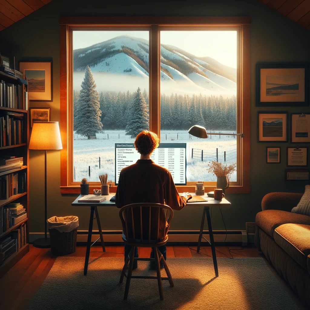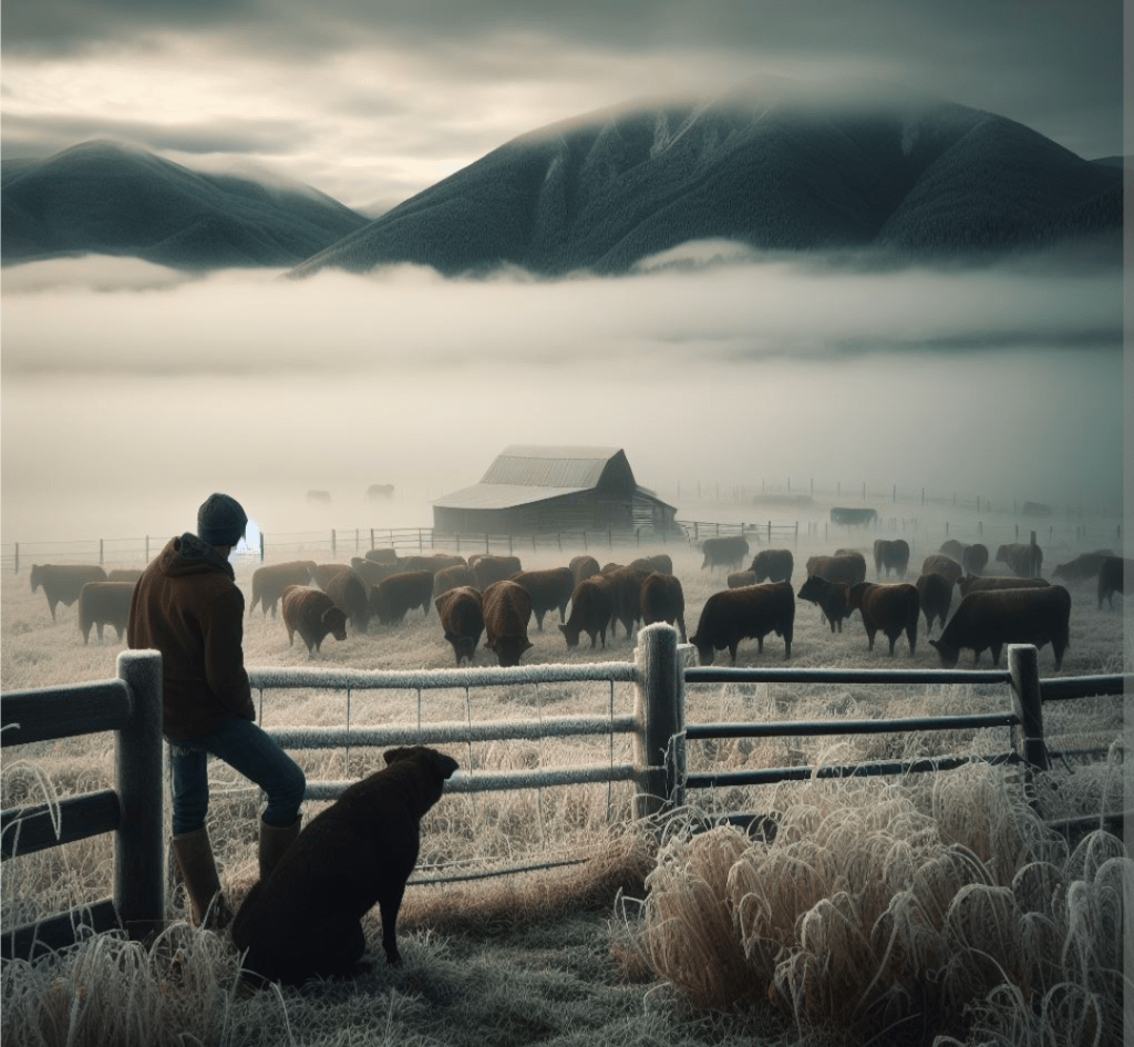 The low clouds and fog are traversing the valley, but I can see Lolo Peak in the distance, and I might even catch a glimpse of sunshine. It’s Sunday morning, and Marcy is watching the gathering herd of cattle as they come over to the beetle barn to say hello on this frosty morning. We just returned from town with a Big Breakfast from McDonald’s. Now, after a post-breakfast walk, I need to head down to town and back home to start the day.
