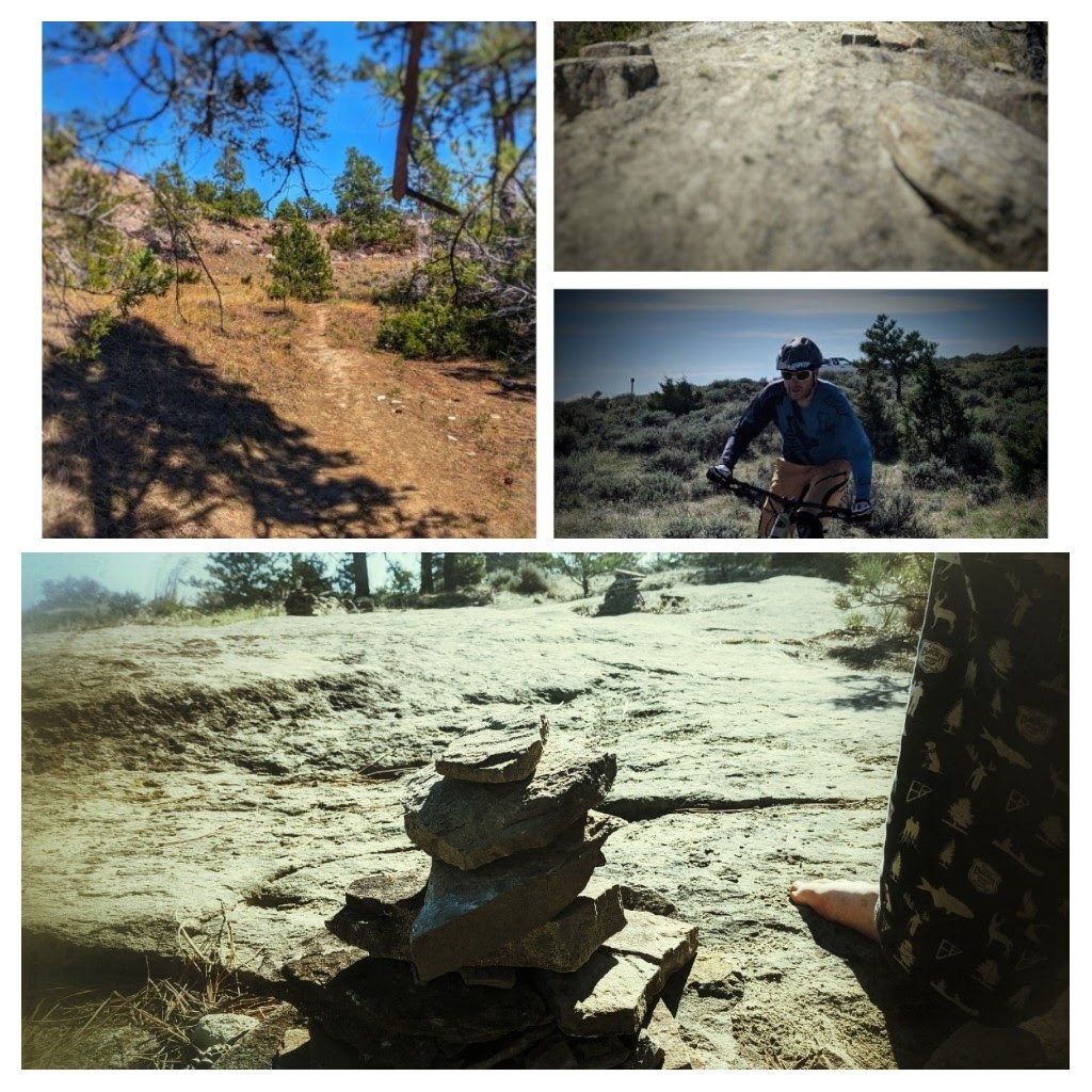 The previous day I was out playing with her and I was progressing. But this morning I felt “ON”. As I approached the 8 foot drop/gap a gust of wind hit me and I decided to bail. I veered to the left to ride down the side. Another gust and I came off my bike a bit and my heel went down to catch me if the bike flopped over. I rammed the heel into the ground and “CRACK”. Darn! Maybe next tear.
