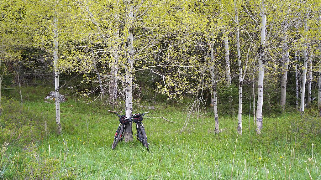 I wasn’t really sleeping. I don’t think. I bivvied out under a swallow’s nest and momma bird was dive bombing me. I was laying on my side looking past my bike at the aspens which seemed to be glowing under the moonshine. Suddenly a light flashed across them. Then again. I jumped into action and started preparing to ride.