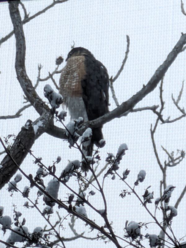 Let’s talk about this feathered mystery guest. At first glance, you might wonder if it’s a Cooper’s Hawk, a familiar sight in Montana’s expansive blue. But this bird was a patchwork of wilderness colors – its back a canvas of slate gray, its chest painted in warm, reddish-brown hues, crisscrossed with darker lines.