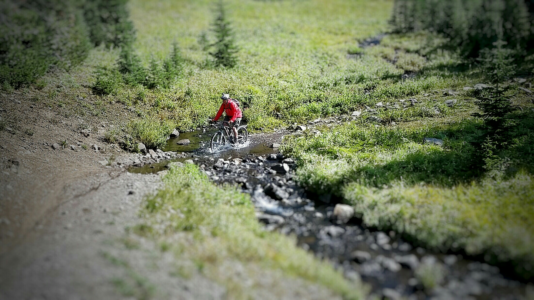 Paul crosses a stream coming out of Emerald Lake and heading back down to the trailhead