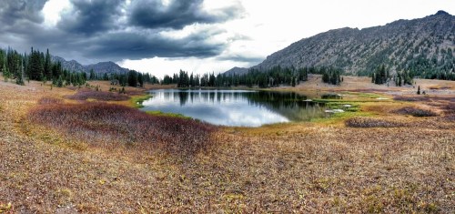 Maroon grasses and a lake contrast all the other colors here at Hyalite Lake